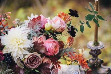 Rustic is another hot trend and it my opinion it’s perfect for Thanksgiving. To create a stunning rustic centerpiece for your thanksgiving dinner table arrange some flowers ivory flowers like peonies, rosebuds, hydrangeas and pair them with some jewel-toned blooms to highlight fall colors like chrysanthemums and arrange all the flowers in wooden vases or for an extra touch of thanksgiving try placing them in a carved out pumpkin for a rustic holiday flair. Use some natural wooden slices under your centerpieces. Use simple white plates and a white table runner to add some class to your place settings. To keep to the rustic theme going you can add little personalized “name” tags on burlap and place them on each plate. If you don’t want to go with name tags but like the burlap idea, use burlap to wrap your cutlery and tie them with some twine and a leaf. Also, place some taper candles in crystal holders on the table for a captivating look.